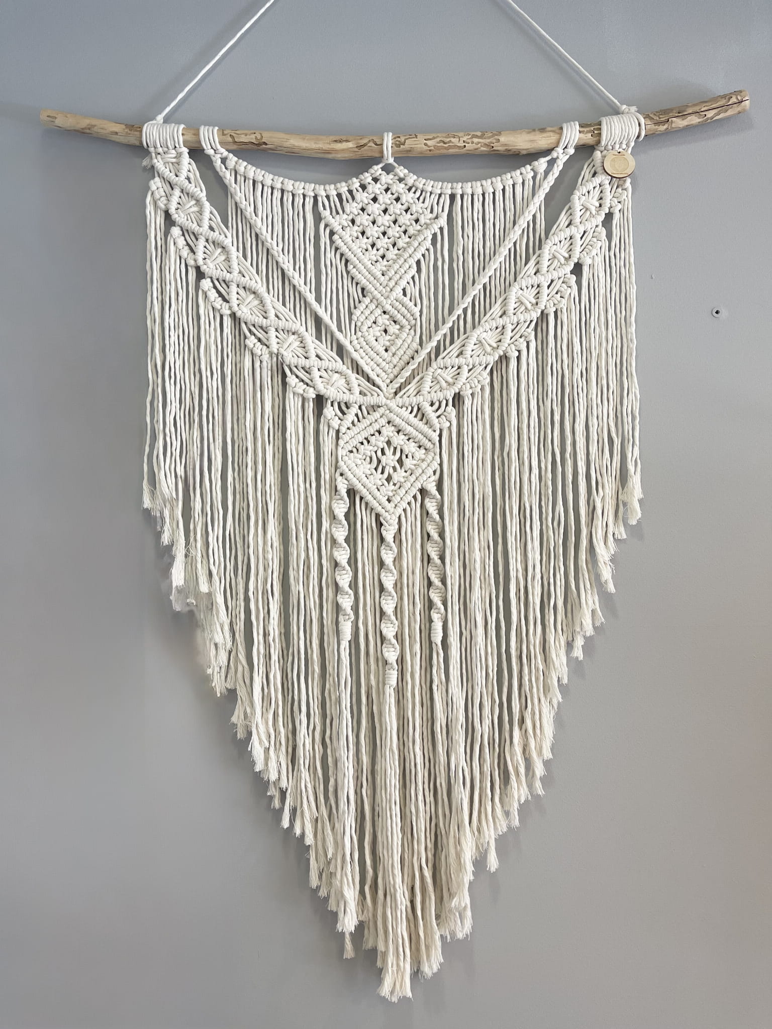 Każda makrama wykonana jest na drewnianym patyku o niepowtarzalnym kształcie, co sprawia, że każda jest wyjątkowa i jedyna w swoim rodzaju.